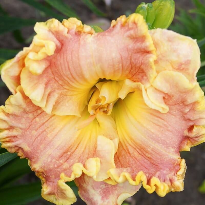 золотой каймой и зелёно - жёлтым горлом. Хорошо гофрирован. Высота цветоноса –